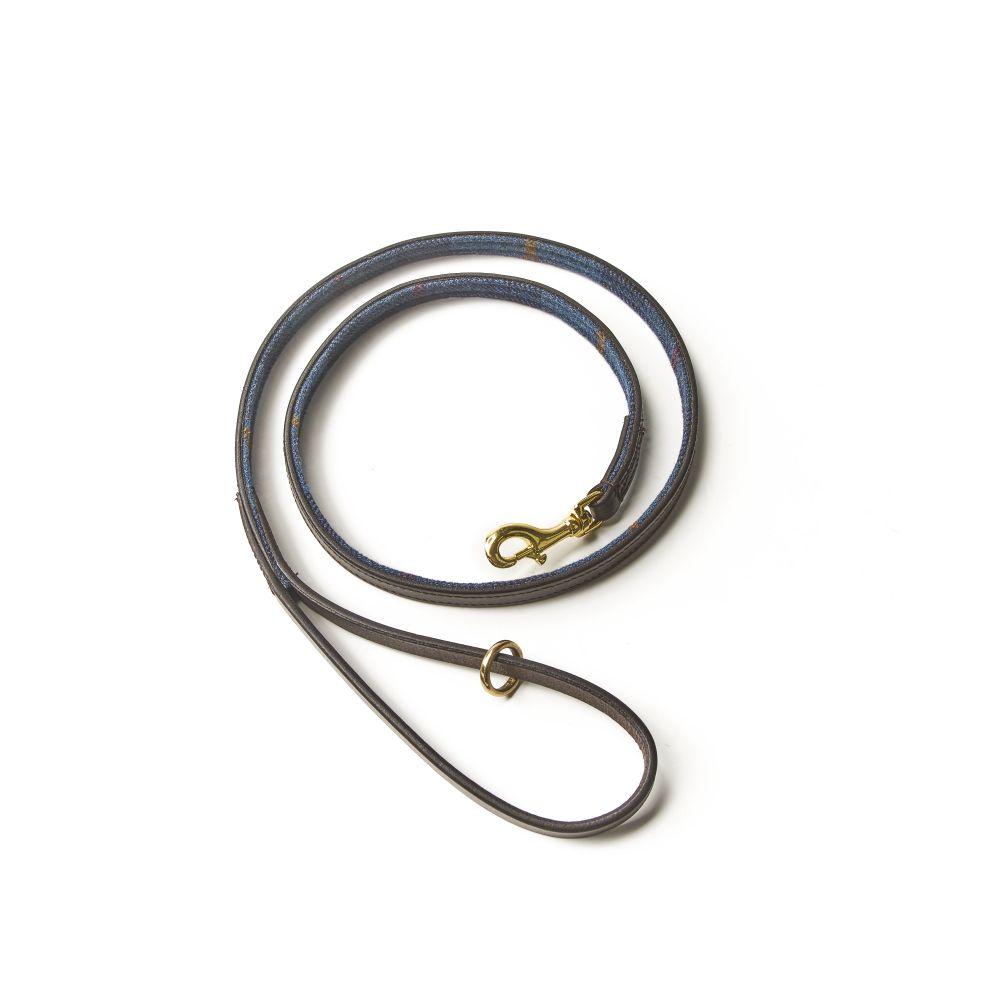 Hundkoppel. Yttertyg i Navy tweed, brunt läder på insidan. 110cm.