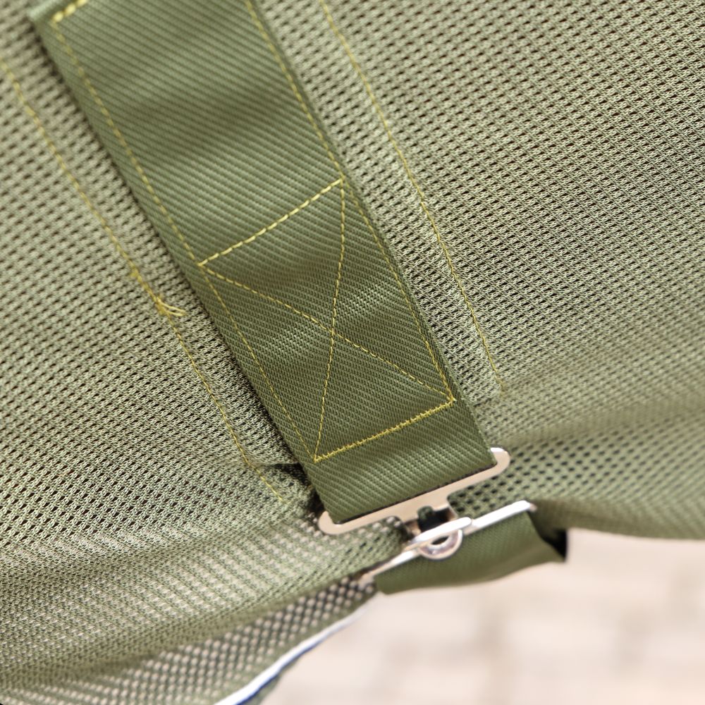 Ett dubbelverkande kyltäcke. Den fleecefodrade överdelen transporterar bort fukt för att hjälpa till att reglera hästens temperatur medan den nedre delen av mesh tillåter luft att cirkulera och värme att försvinna. Perfekt efter intensiv träning eller tvätt. Dubbla bogspännen, justerbara kryssgjordar, svansband