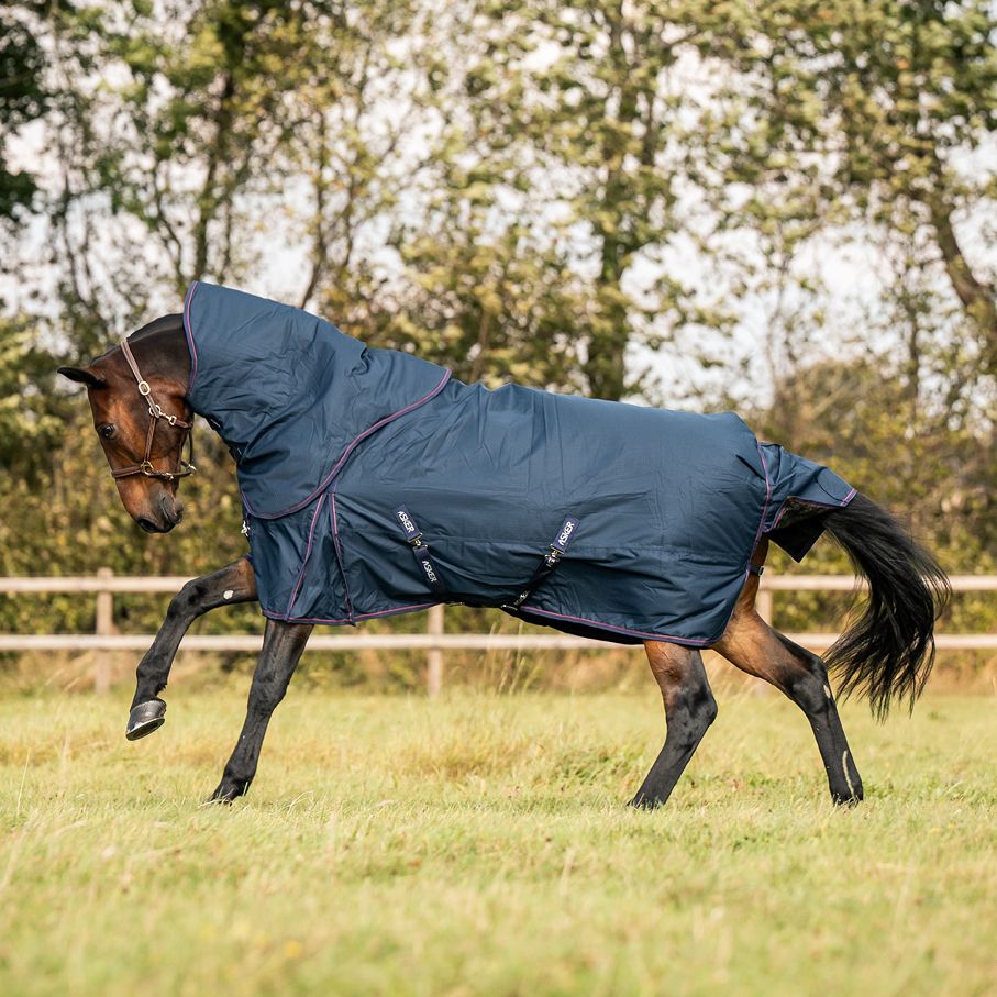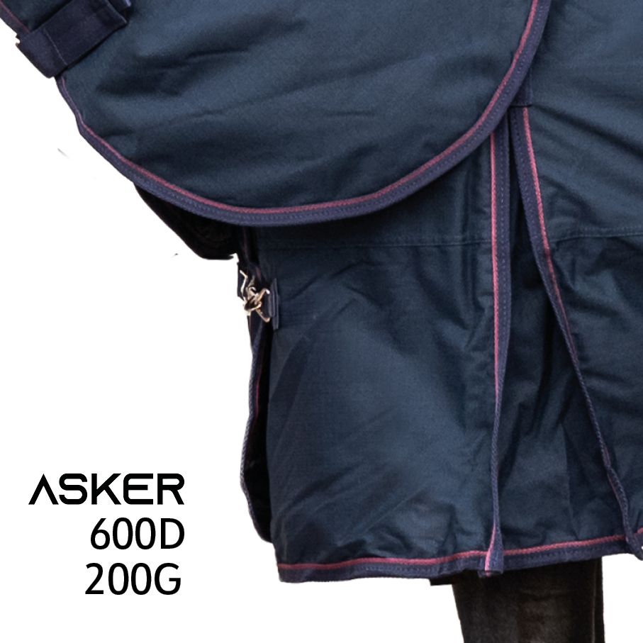 Asker erbjuder hållbara och prisvärda hästtäcken för alla väder. Modell här i 200g vintertäcke tillsammans med ett 200g halstäcke.